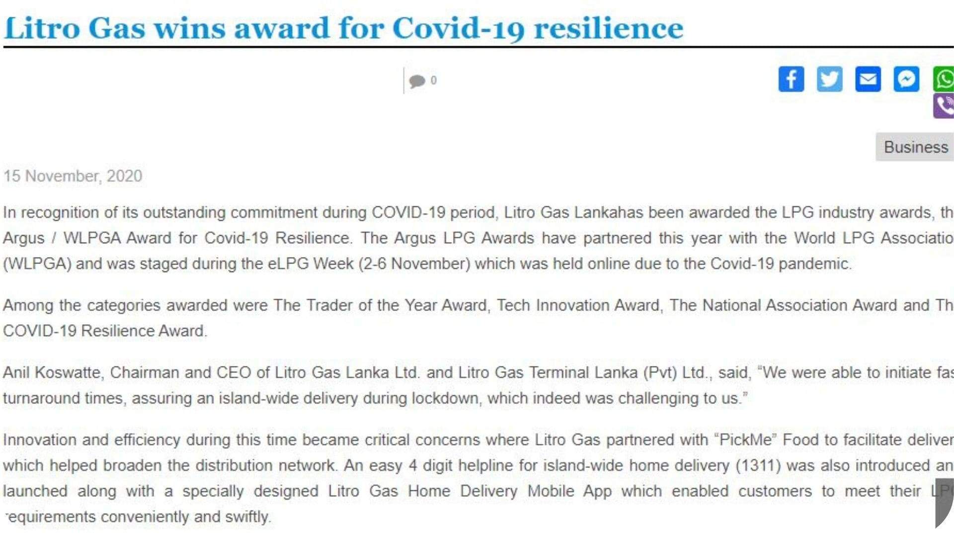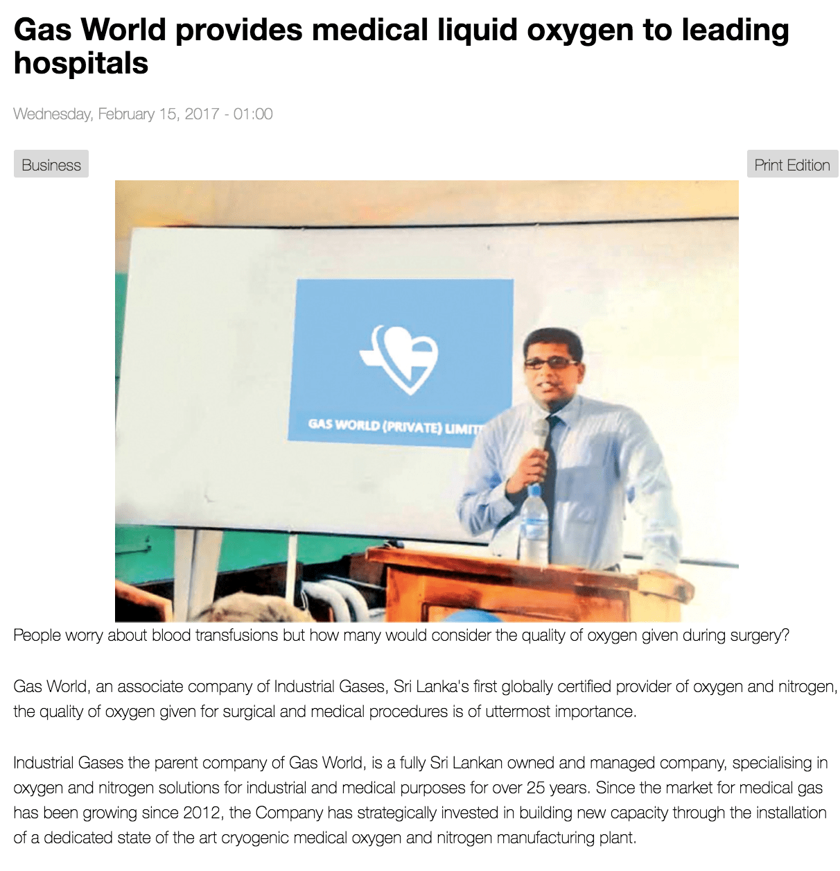 Gas World, an associate company of Industrial Gases, Sri Lanka's first globally certified provider of oxygen and nitrogen, the quality of oxygen given for surgical and medical procedures is of uttermost importance. The Company provides bulk medical liquid oxygen to over 10 leading hospitals in Sri Lanka and is focused on maintaining standards as industry parameters, he reiterates.