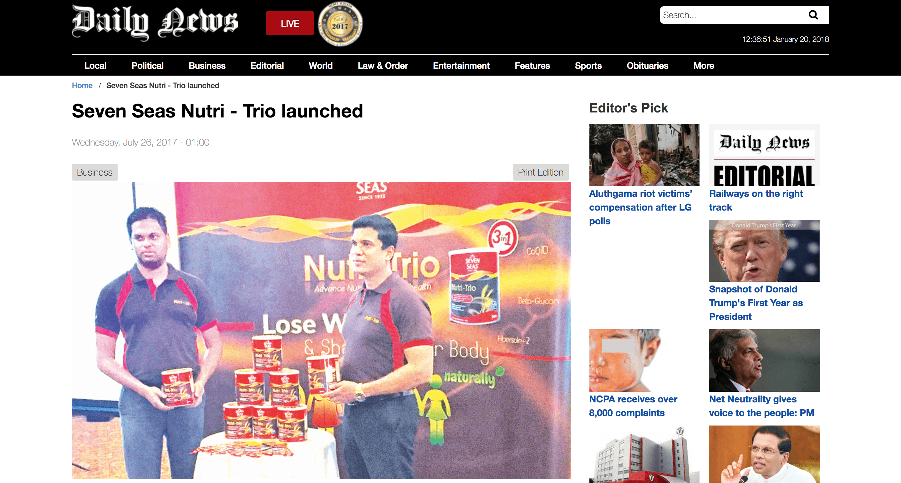 Seven Seas Nutri-Trio, was launched recently in Sri Lanka as a naturally derived nutritional supplement, that contains high strength Beta Glucan from Oat Bran, CoQ10 and Fibersol. Public Relations | Niche Corporate Communications.
