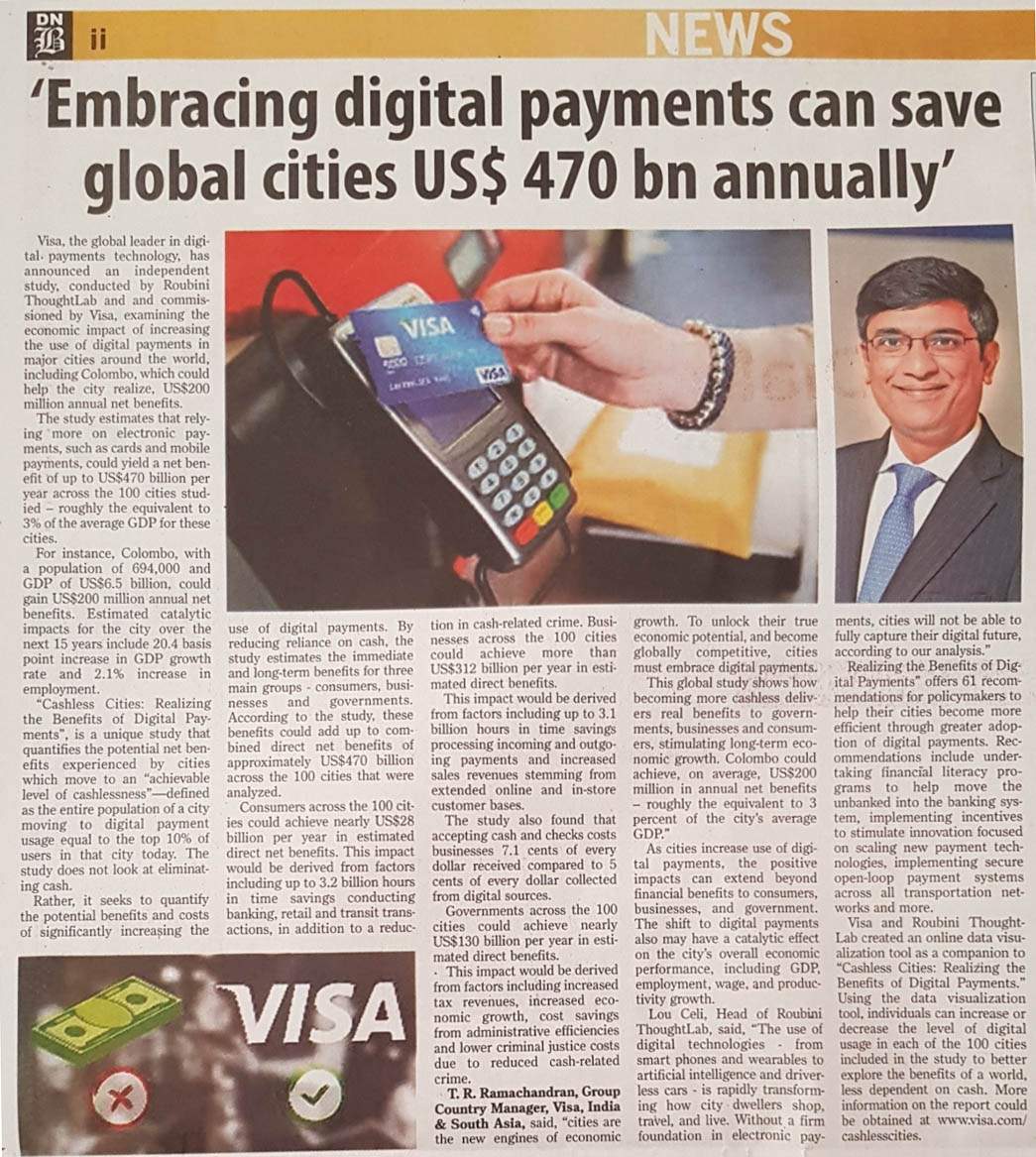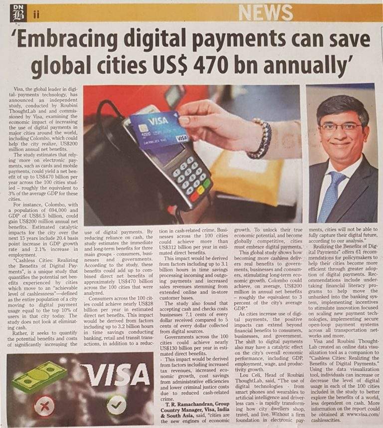 Visa, the global leader in digital payments technology, has announced an independent study, conducted by Roubini ThoughtLab and and commissioned by Visa, examining the economic impact of increasing the use of digital payments in major cities around the world, including Colombo, which could help the city realize, US$200 million annual net benefits. Public Relations | Niche Corporate Communications.