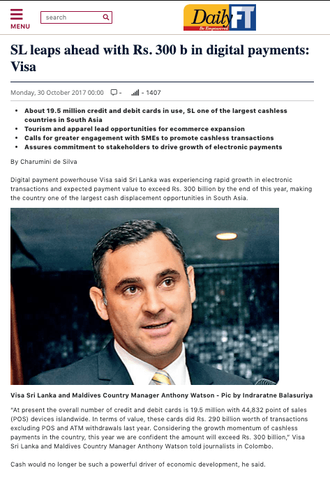 Digital payment powerhouse Visa said Sri Lanka was experiencing rapid growth in electronic transactions and expected payment value to exceed Rs. 300 billion by the end of this year, making the country one of the largest cash displacement opportunities in South Asia. Public Relations | Niche Corporate Communications.